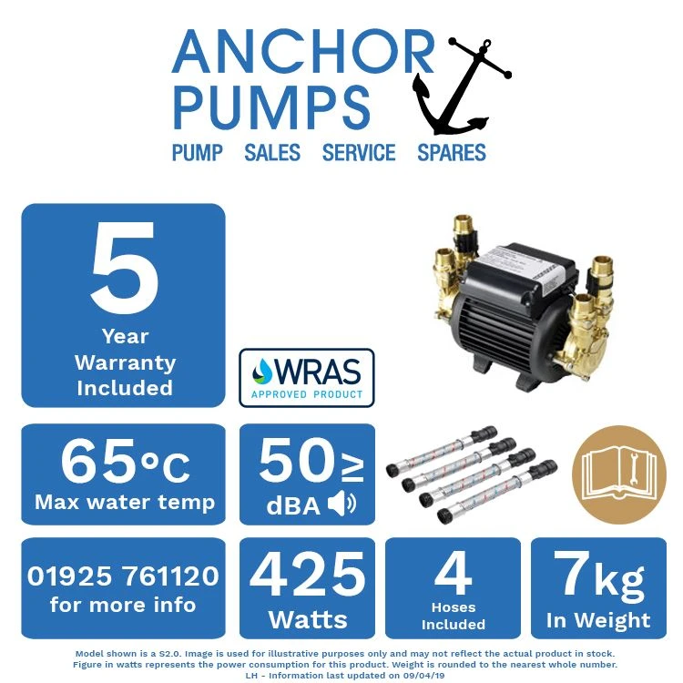 Designed for installation into open vented systems, the S2.0 bar twin pump is suitable for positive head applications and only requires a 0.6 l/min flow to start.